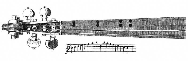 The Fiddle is a difficult Instrument to learn because there are no fix'd Places to stop the Fingers on; for when a scholar is taught to play in one Key, beginning in another Key alters the situation of the Fingers so much that we in a manner undo all we were doing before. . . I have drawn a Scale for every practical Key, by representing the Finger Board of the Fiddle with strings and placing Spots thereon, to show where the Fingers should be put to stop each Note in tune, and though the scholar can't at first stop with Exactness, he will see where the Fingers should be put. Though I am satisfy'd these Scales will be of great use for stopping in Tune, nevertheless we must depend on the Ear as Umpire.[35]