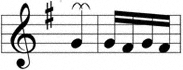 Three sample ornaments are presented below using western musical notation. The ornament’s notation and ornament symbol are found in the first measure of each example, and the notation of what the ornament should sound like is found in the second measure of each example.